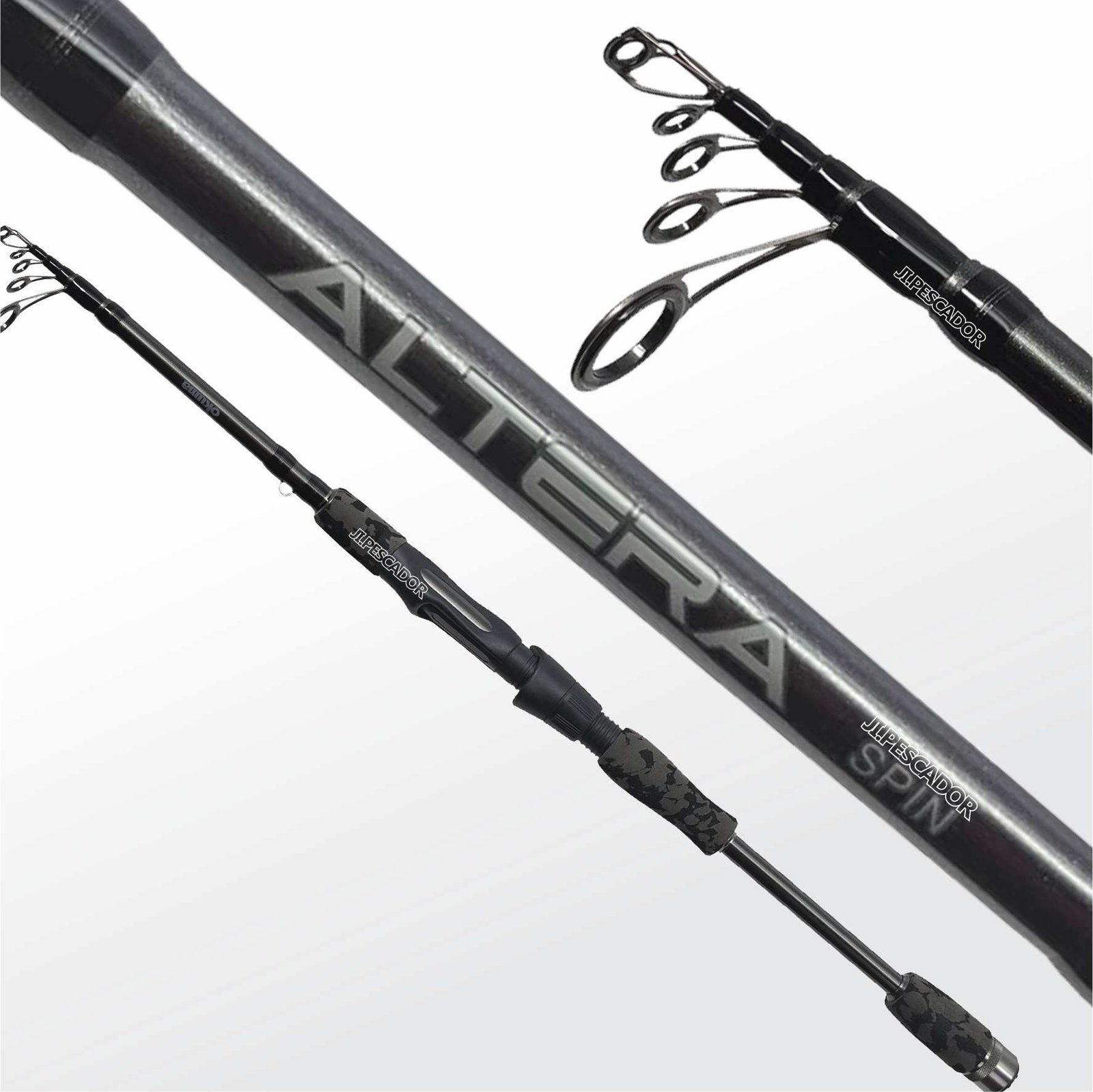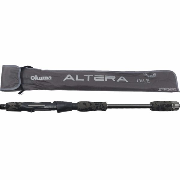 * La caña Okuma Altera Tele Spin presenta una construcción de carbono ultraligero 24T, guías SIC con marcos color gris humo mate, y también posee blanks delgados de acción rápida